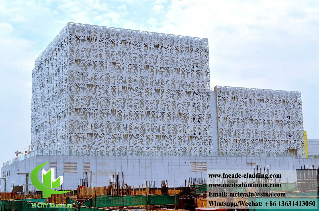 Professional perforated metal facade systems featuring custom patterns and durable white powder coating for architectural applications.